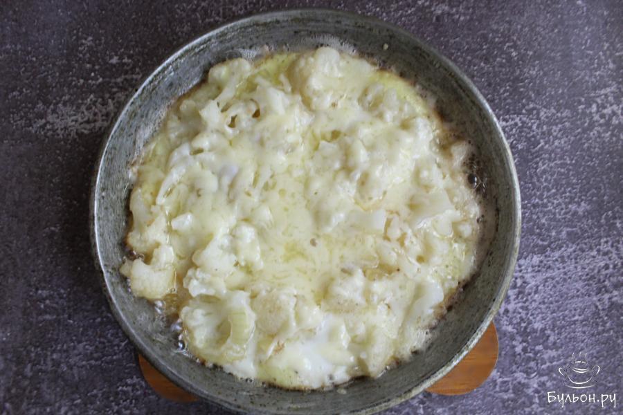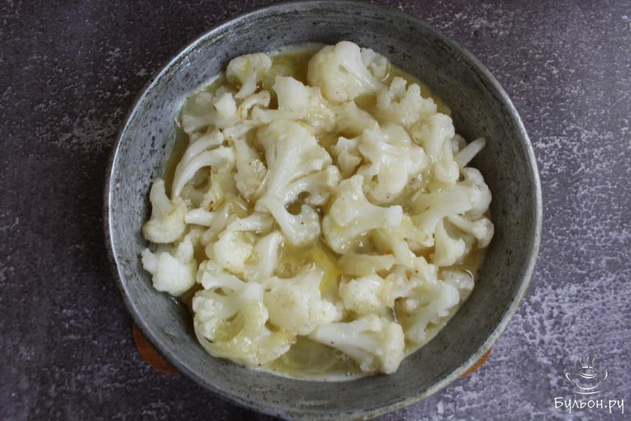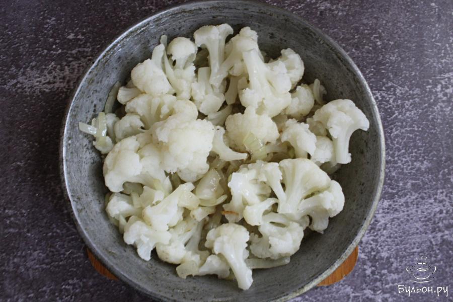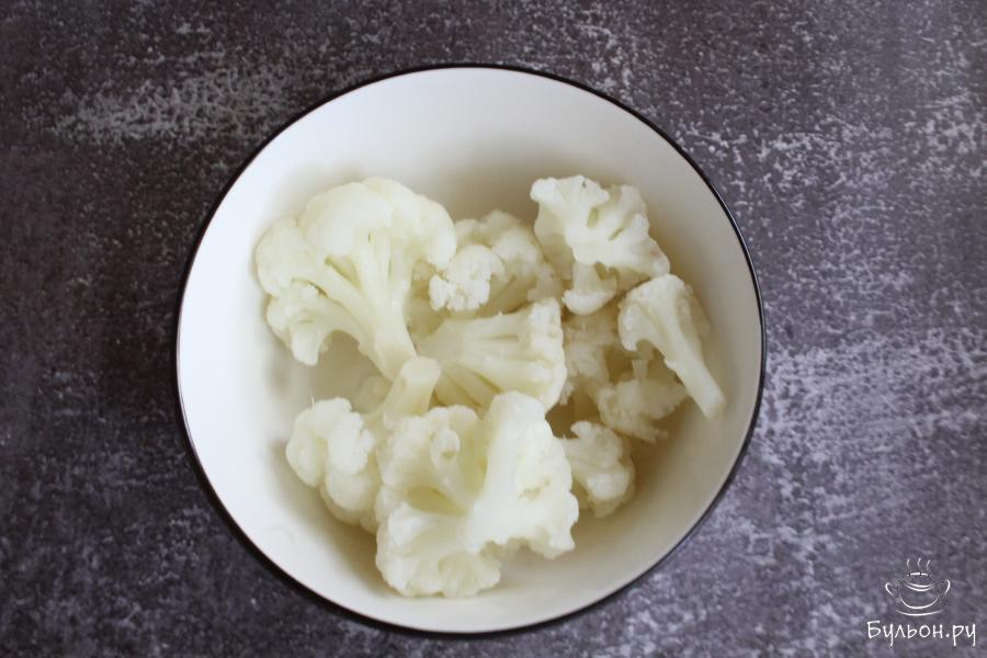1. Цветную капусту разобрать на мелкие соцветия, отварить ее в кипящей воде 7-10 минут. Откинуть капусту на дуршлаг.