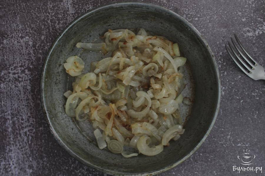 2. Лук почистить, промыть, нарезать тонкими полосками и обжарить на сковороде с разогретым маслом, до мягкости.