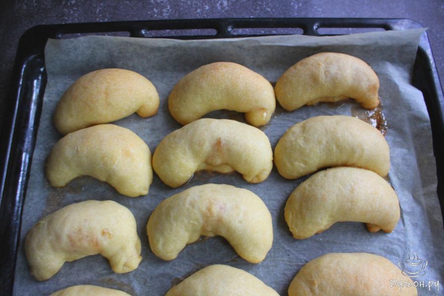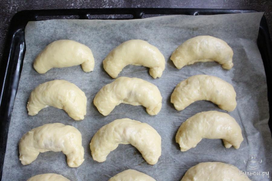 7. Свернуть тесто плотными рулетиками и загнуть края булочек, делая форму выпечки похожую на банан. Выложить булочки на противень.