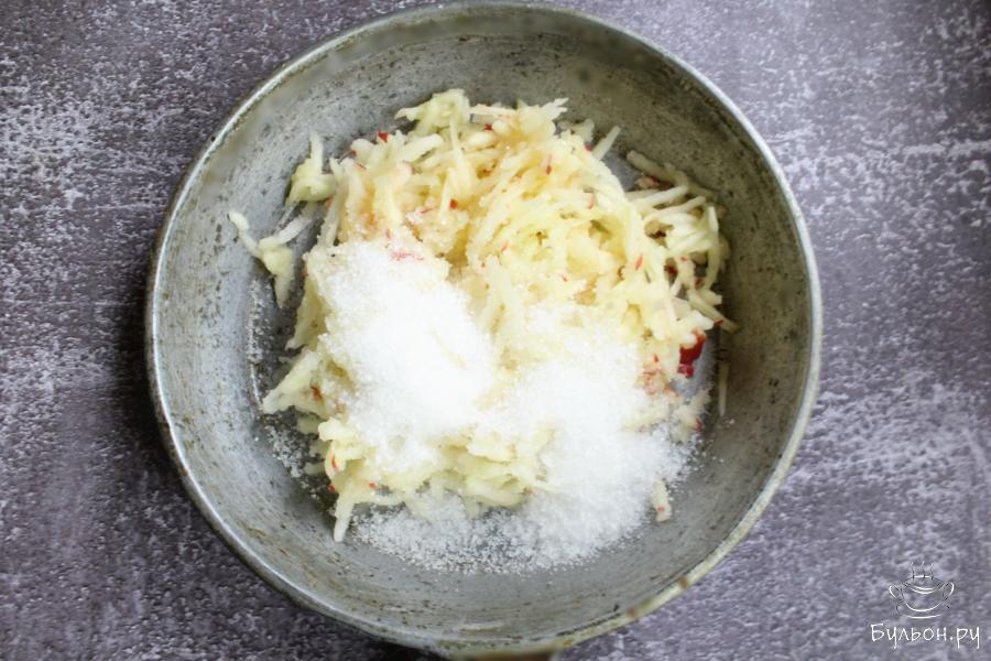 5. Пока тесто поднимается, можно приготовить начинку. Яблоки почистить от серединок с семечками, перетереть яблоки через крупную терку, выложить их на сковороду, добавить сахар по вкусу. Тушить яблоки 10 минут, сразу помешивать, чтобы яблоки дали сок и не пригорели.