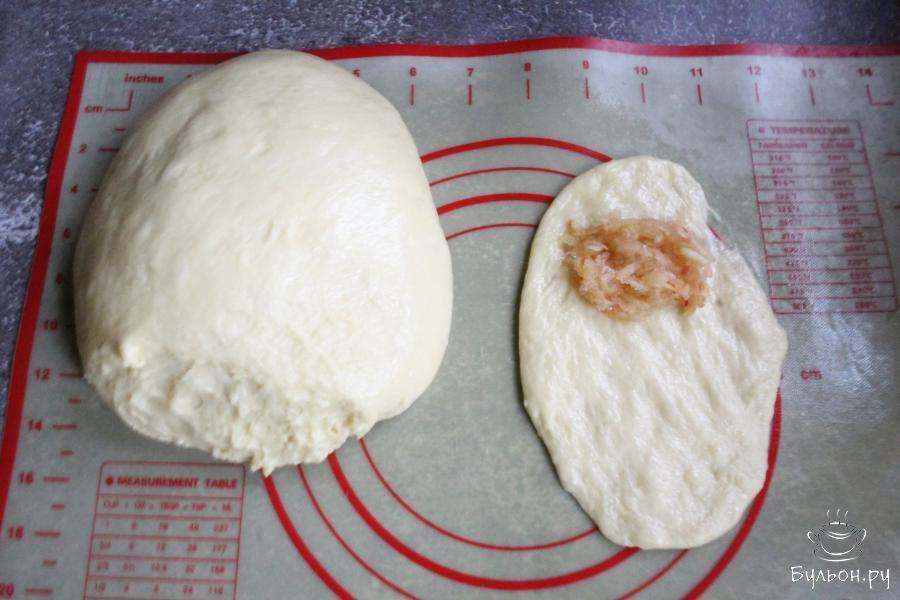 6. Руки смазать маслом, тесто вымесить и разделить на 14-16 кусочков. Каждый кусочек теста руками размять в овальный, длинный и тонкий пласт, выложить на край теста 1-2 ч. л. начинки.