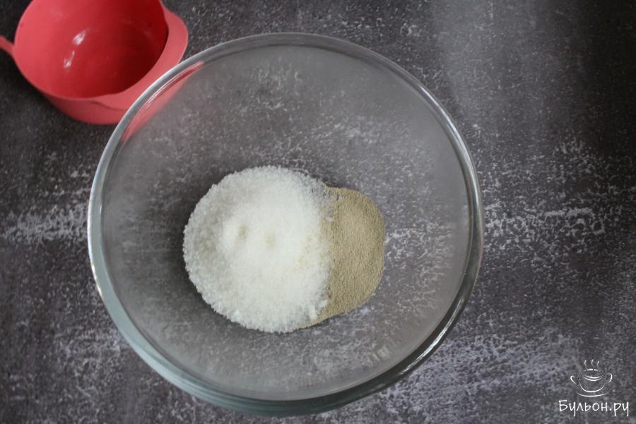 1. Выложить в чашку соль, дрожжи и почти весь сахар. Если яблоки кислые, то немного сахара оставить для начинки.