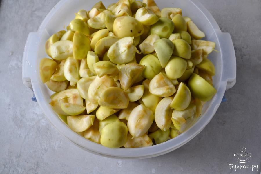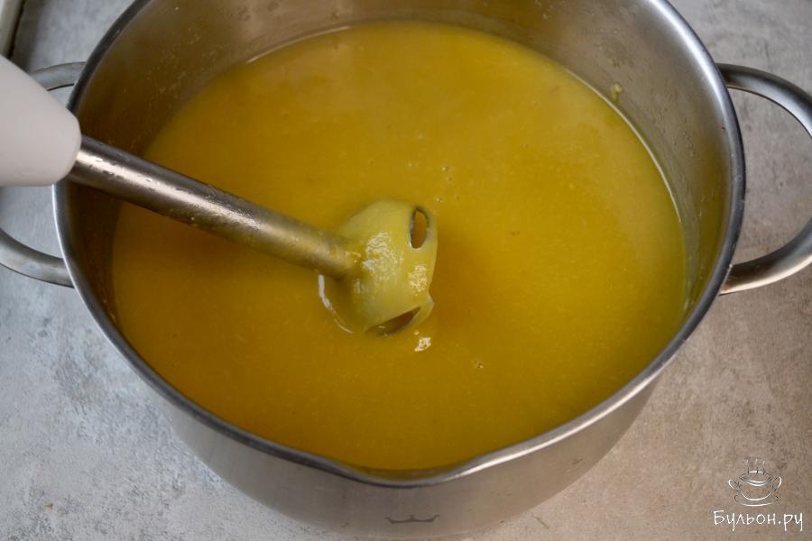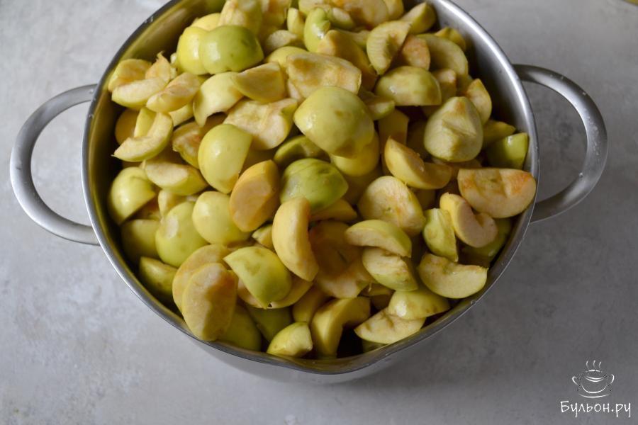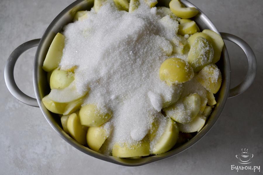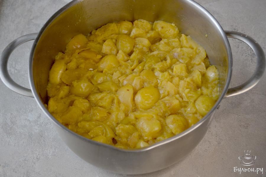 6. Всыпьте в кастрюлю оставшийся сахар, перемешайте и поставьте на огонь. Доведите до кипения, сделайте огонь минимальным и варите, часто помешивая, чтобы повидло не пригорело ко дну.