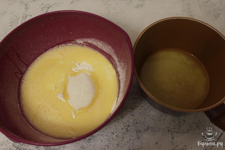 2. Растопите сливочное масло, добавьте 0,5 ч. л. соли и дайте ему остыть. В это время в миску для замеса просейте оставшуюся муку, переложите опару, всыпьте оставшийся сахарный песок, добавьте взбитые вилкой 2 куриных яйца. Все ингредиенты тщательно перемешайте.