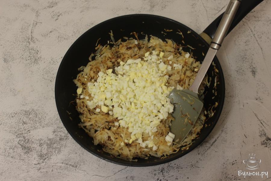 4. Нашинкованную капусту выложите на сковороду, разогретую с растительным маслом. Жарьте на сильном огне, постоянно помешивая. Отварные остывшие 3 яйца нарежьте небольшими кубиками и добавьте к капусте, посолите, перемешайте и дайте начинке остыть.