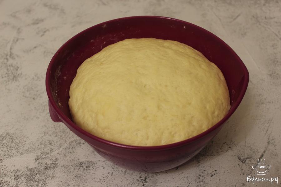 3. Теперь, частями, добавьте остывшее подсоленное сливочное масло и замесите тесто. При необходимости, подсыпьте тесто мукой. Миску очистите от остатков теста, растительным маслом смажьте миску внутри, положите тесто, накройте полотенцем и оставьте на расстойку, на 1,5 часа.