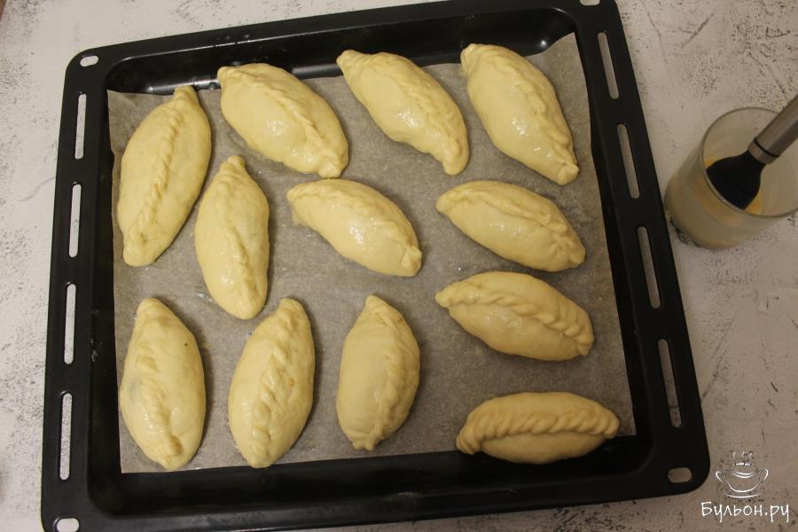6. Пирожки выложите на противень, застеленный пергаментом, смажьте взбитым яйцом и поставьте в духовку, разогретую до 180 градусов, на 40 минут.