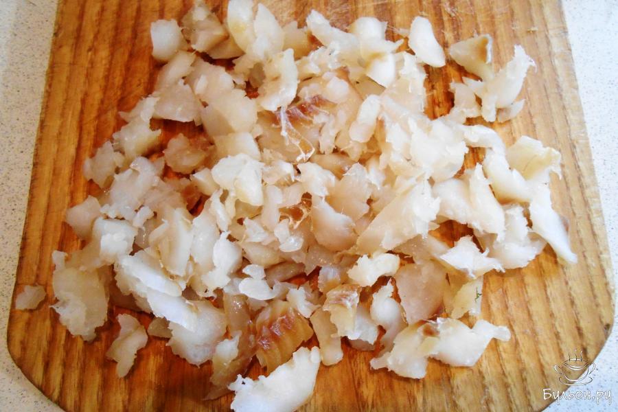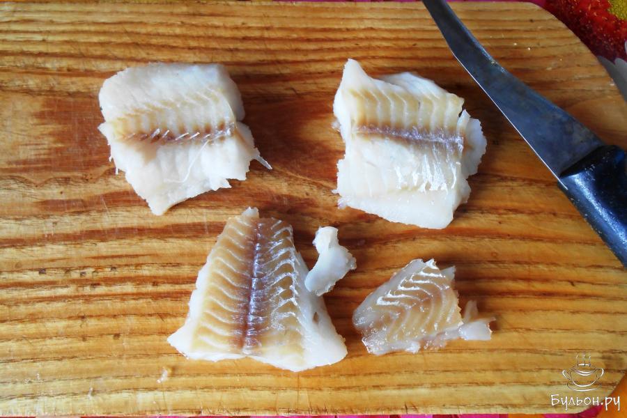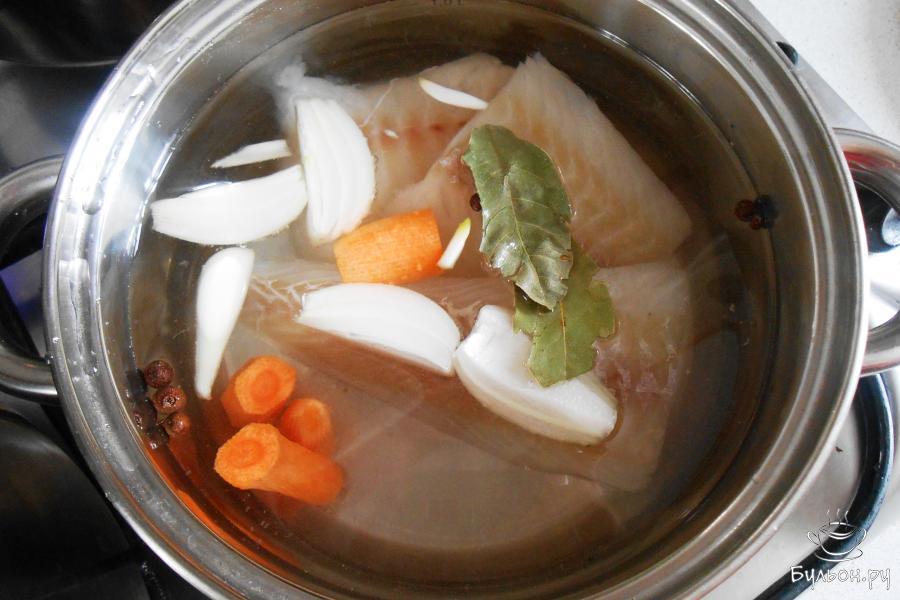 2. Положить в маленькую кастрюльку треску, лук, морковь, лавровые листы, перец горошком. Налить воду и посолить по вкусу, довести до кипения и варить 10 минут.
