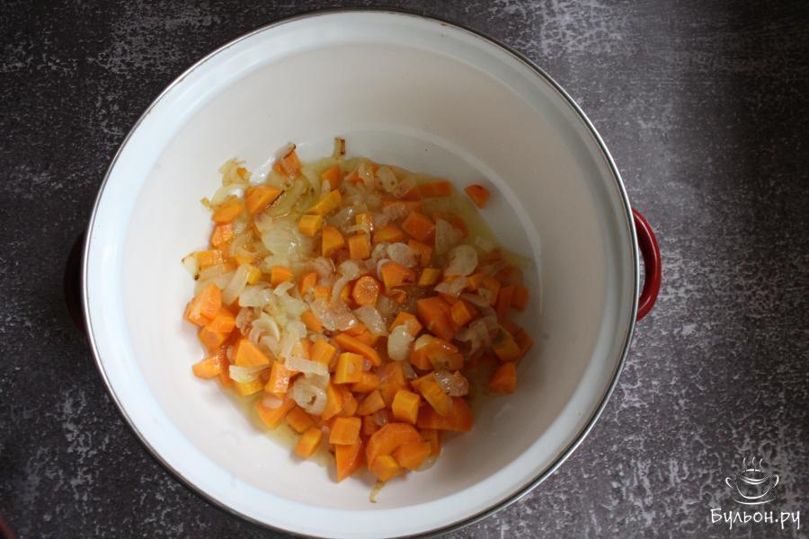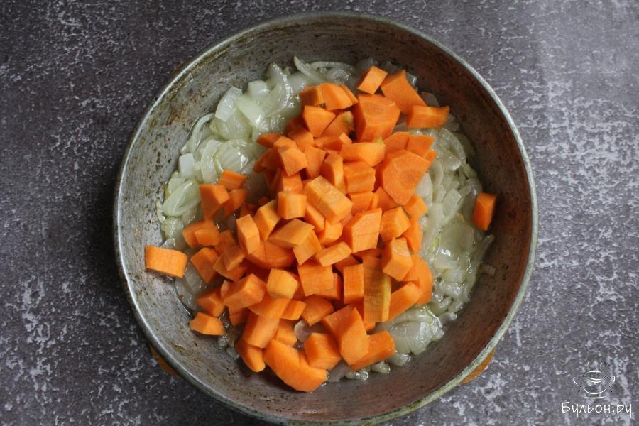 2. Морковь почистить, промыть, нарезать кубиками, выложить морковь на сковороду и обжарить 5-6 минут.