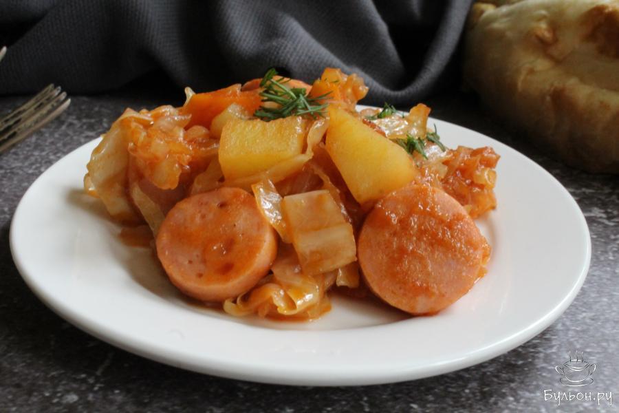 Овощное рагу с капустой и сосисками - блюдо легкое, оно отлично подходит для обеда и даже для ужина. Рагу без мяса, поэтому готовится оно быстро. Это блюдо получается яркое, сочное, вкусное, насыщенное и ароматное. Если вы любите блюда из капусты, попробуйте приготовить и такое рагу, наверняка оно вам понравится. Зелень для этого блюда можно брать любую, которую вы любите. В рагу можно добавить свои любимые пряности.