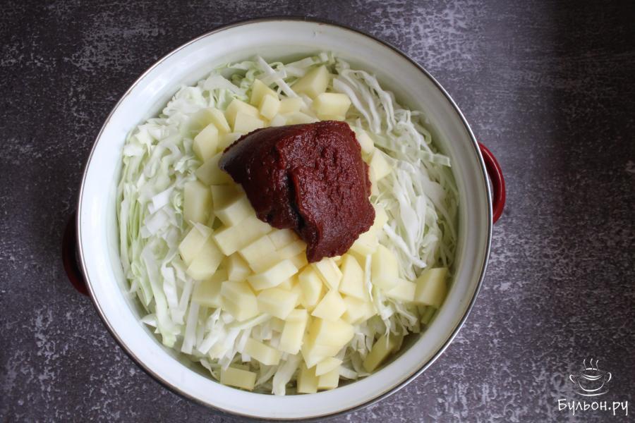 6. Добавить к овощам томатную пасту, соевый соус, воду. Поставить посуду на огонь и тушить овощи 15-20 минут, под крышкой.