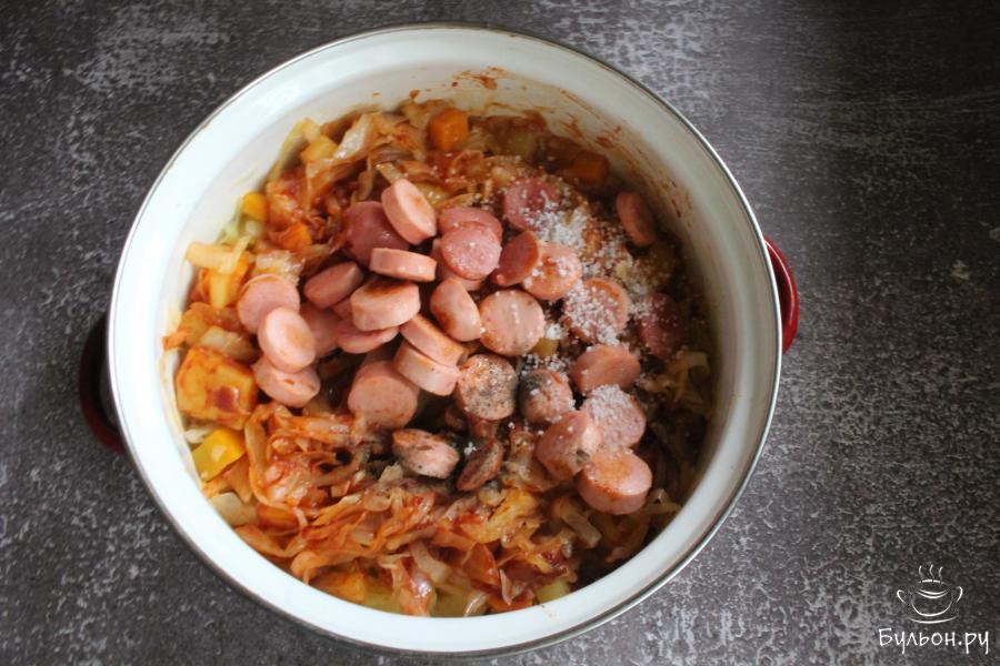 8. Добавить сосиски к овощам, посолить и поперчить рагу по вкусу, перемешать и готовить еще 5 минут.