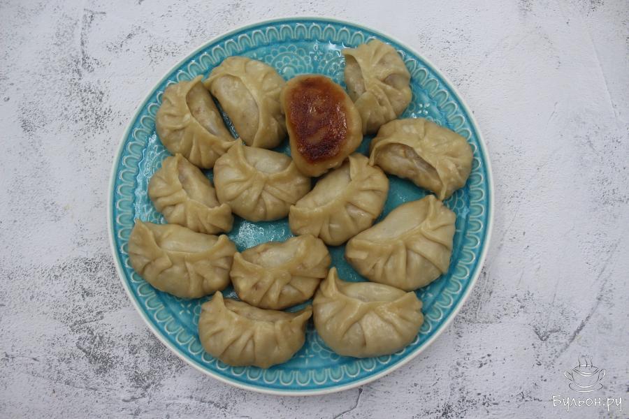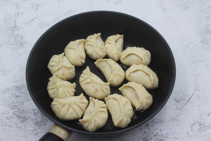 4. Слепленные пельмени обжарьте на растительном масле с одной стороны. Затем влейте 100 мл. кипятка в сковороду, закройте крышкой и готовьте 5-7 минут. Затем крышку откройте и продолжайте жарить до полного выпаривания воды.