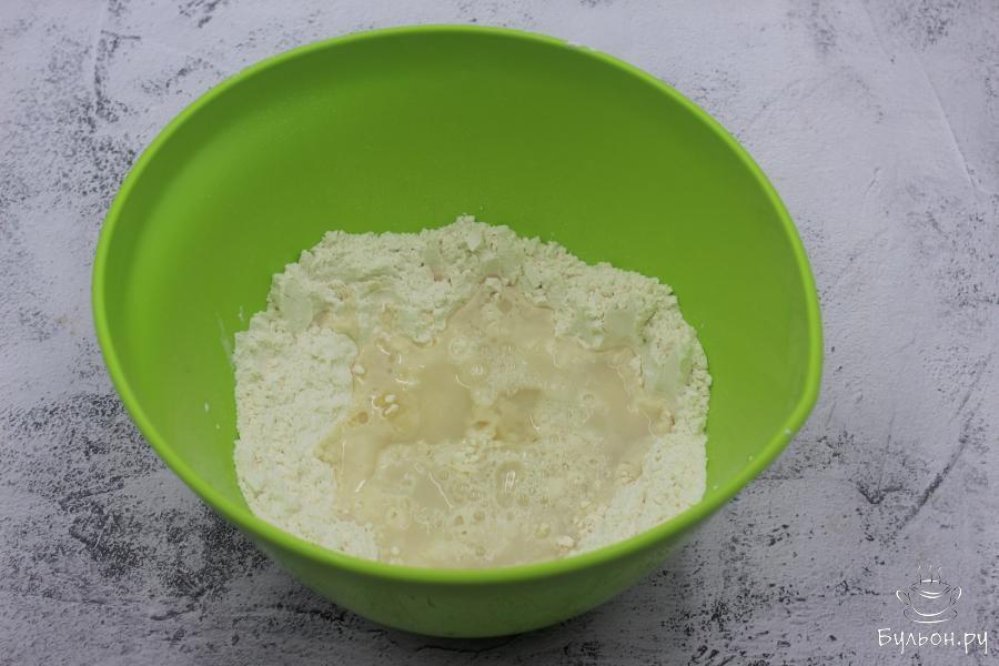 2. В миску просейте муку. В отдельной кружке смешайте 170 мл. кипятка с 0,5 ч. л. соли. Соленый кипяток перелейте к муке и добавьте 1 ст. л. растительного масла. Замесите тесто. Переложите его на полчаса в полиэтиленовый пакет.