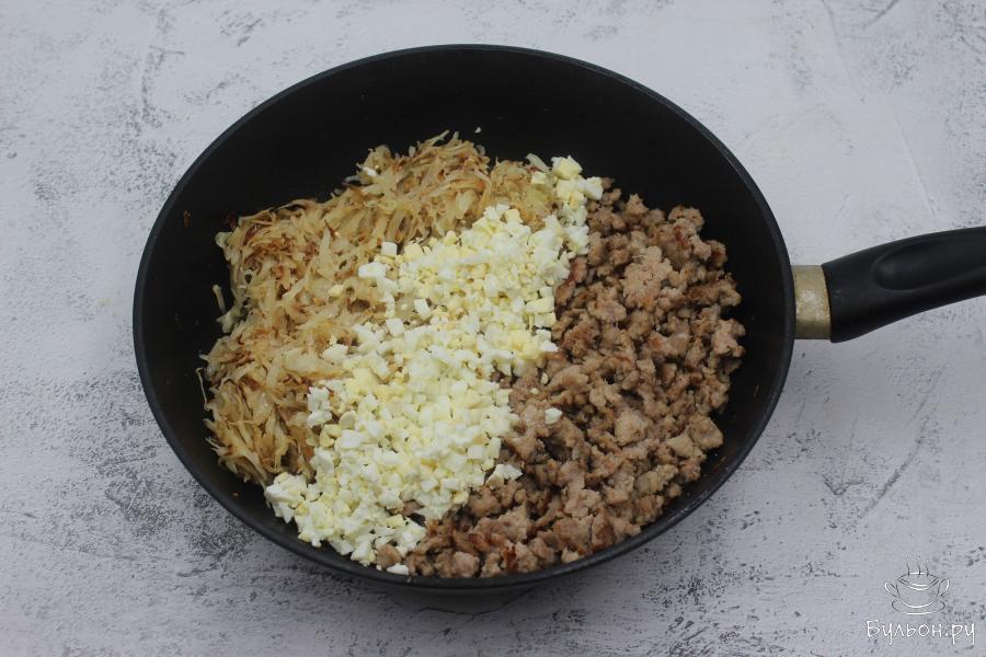 1. На сковороде слегка обжарьте фарш. Затем переложите его в миску. На этой же сковороде обжарьте нашинкованную и обмятую капусту. Затем верните в сковороду фарш и добавьте нарезанные кубиками отварные яйца, посолите и перемешайте.