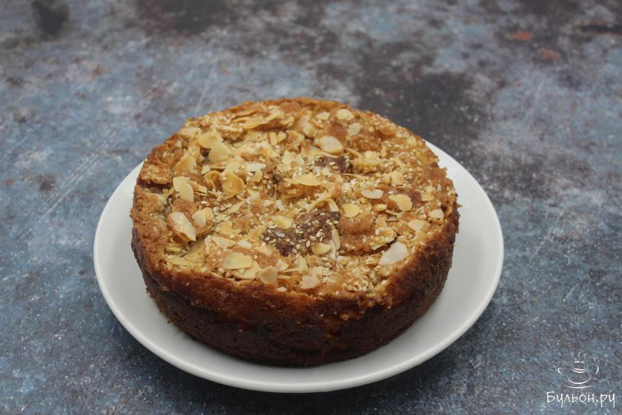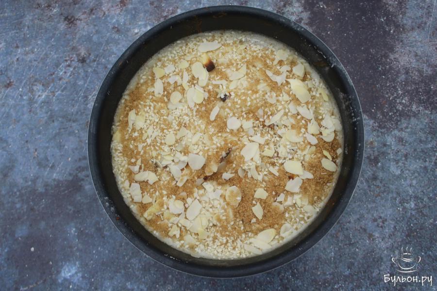6. Через указанное время достаньте пирог из духовки, сразу же вылейте поверх пирога приготовленную яично-молочную смесь. Сверху присыпьте миндальными лепестками, кунжутом и тростниковым сахаром.