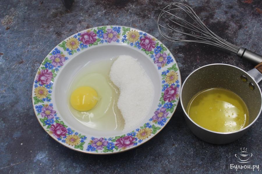 5. В это время растопите сливочное масло и остудите его. В миске взбейте 1 яйцо с 70 гр. сахара и соедините с остывшим растопленным маслом.