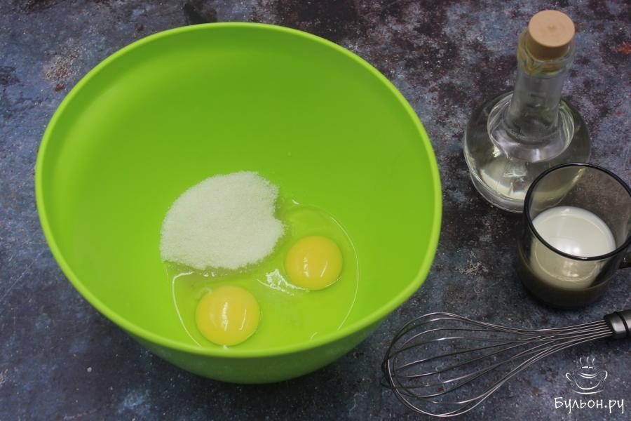 1. В миску вбейте 3 яйца, всыпьте 90 грамм сахара и 2 щепотки соли. Взбейте венчиком. Затем влейте молоко и рафинированное масло, снова перемешайте венчиком.
