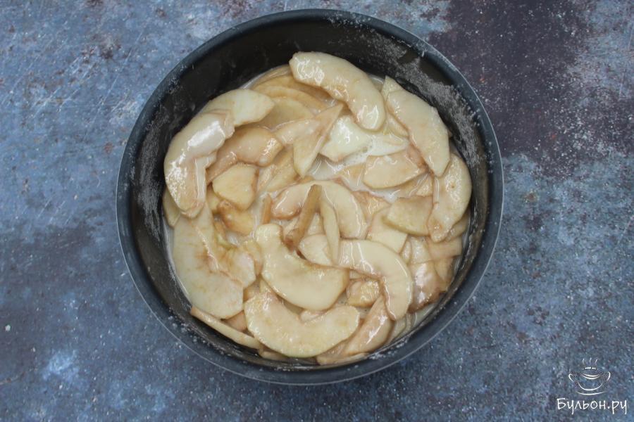 3. Вымытые яблоки очистите от кожицы, удалите семечки и нарежьте тонкими пластинами. Переложите яблоки в тесто и перемешайте.