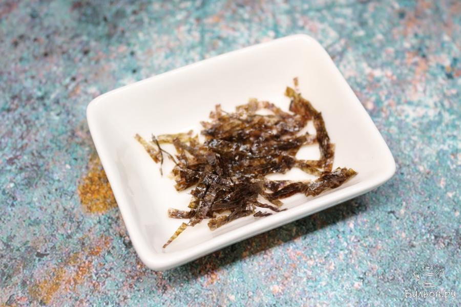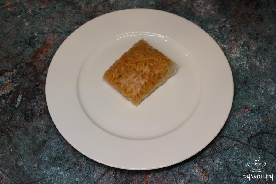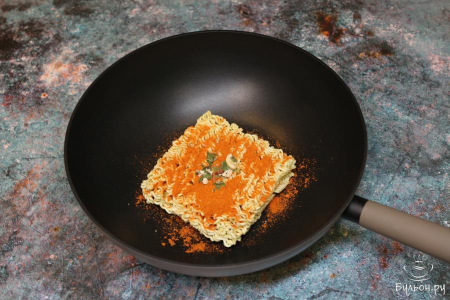 1. В сковороду выложите рамен быстрого приготовления, добавьте сухие овощи и специи, которые прилагаются к ней, а также приправу.