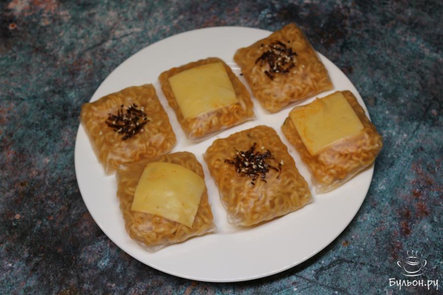 7. Выложите рулетики на блюдо. Сверху спринг роллы с раменом и сыром украсить кусочком сыра, а другие посыпьте семенами кунжута и соломкой из нори. Приятного аппетита.