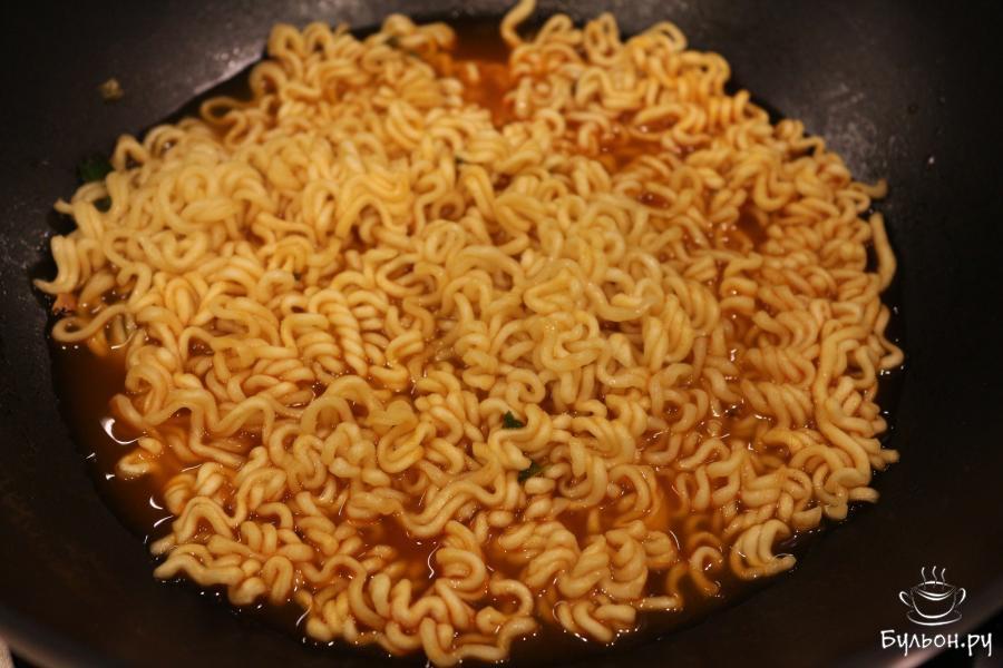 2. Вскипятите воду. Влейте ее в сковороду. Постоянно помешивая и переворачивая лапшу, доведите ее до мягкого состояния, это 4-5 минут. Затем воду слейте.