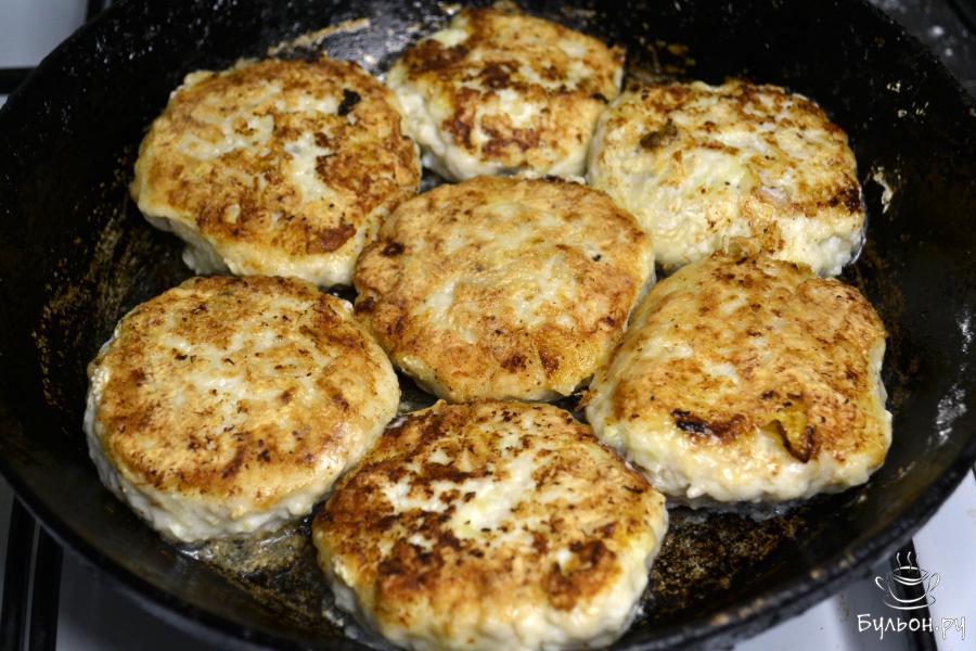 9. 3-5 минут обжаривайте котлеты на сильном огне, затем сделайте огонь минимальным и жарьте до румяной корочки 10-13 минут. Затем переверните и также обжаривайте котлеты со второй стороны. После того, как котлеты перевернули, обжаривайте их под крышкой.