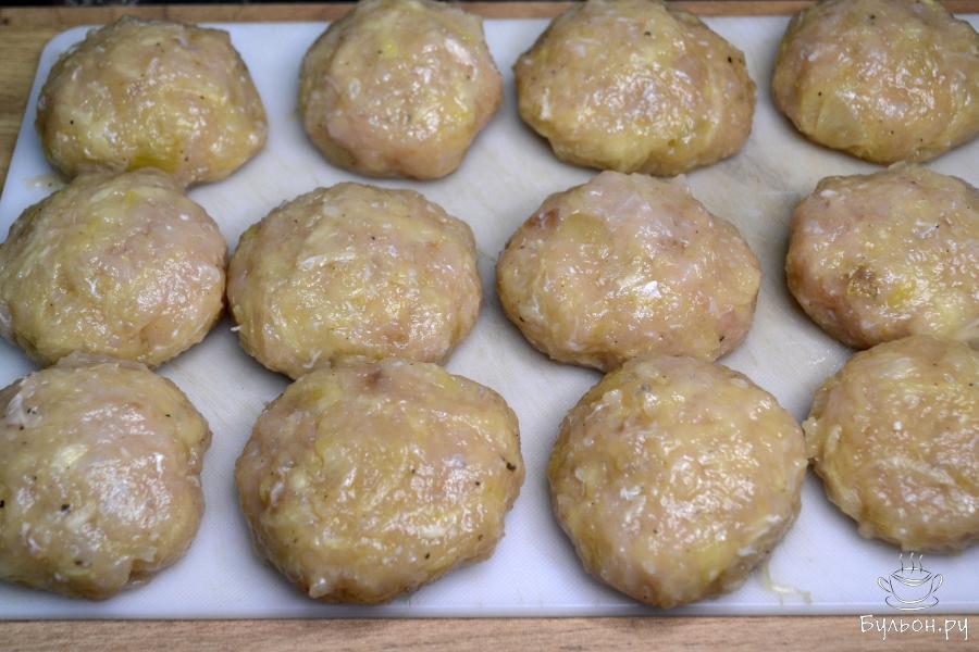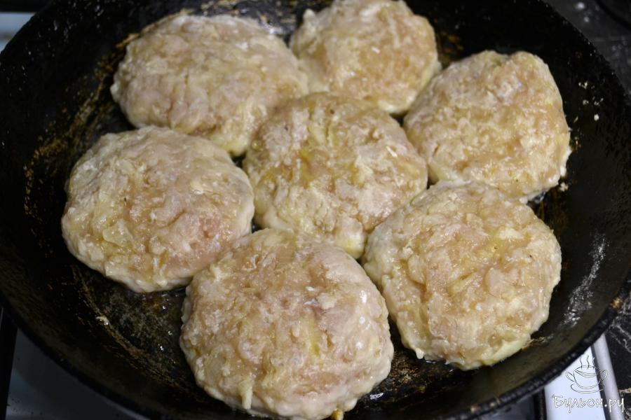 8. Запанируйте котлеты с обеих сторон в муке, разогрейте сковороду с растительным маслом и положите на нее котлеты.