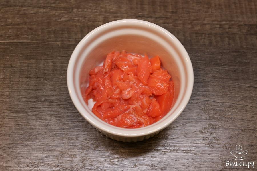 5. Теперь на тарелку выложите кусочки лосося, икру, кусочки сыра. Добавьте в салат немного оливкового масла, сбрызнете лимонным соком. Овощной салат с лососем и икрой можно подавать к столу.