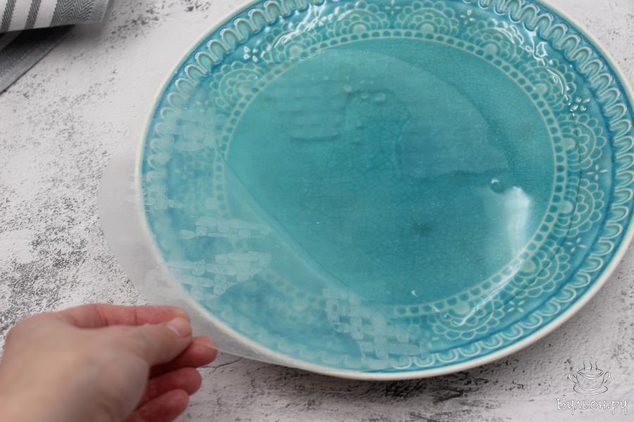 2. Возьмите лист рисовой бумаги и в достаточно широкой тарелке окуните его в воду. Все края бумаги должны намокнуть.