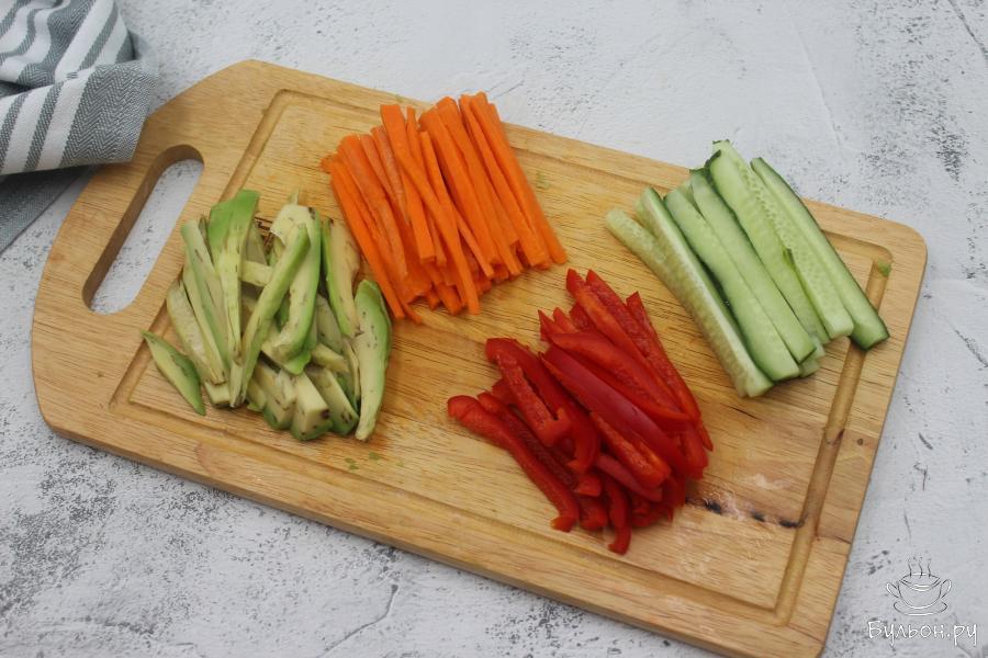 1. Подготовьте овощи. При необходимости очистите их, вымойте и обсушите. Болгарский перец, огурец, морковь и авокадо нарежьте соломкой.