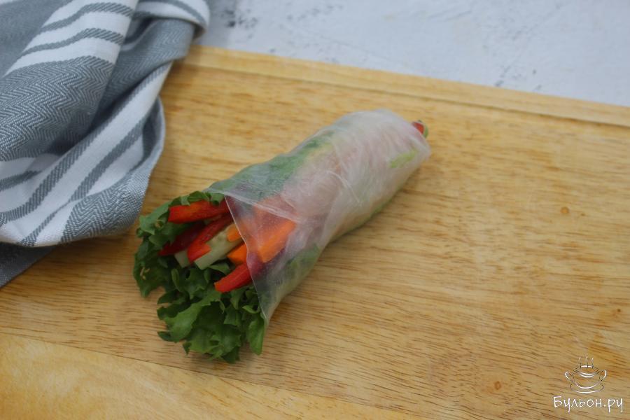 4. Сверху накройте овощи противоположным краем рисовой бумаги, после чего плотно сверните овощи в ролл.