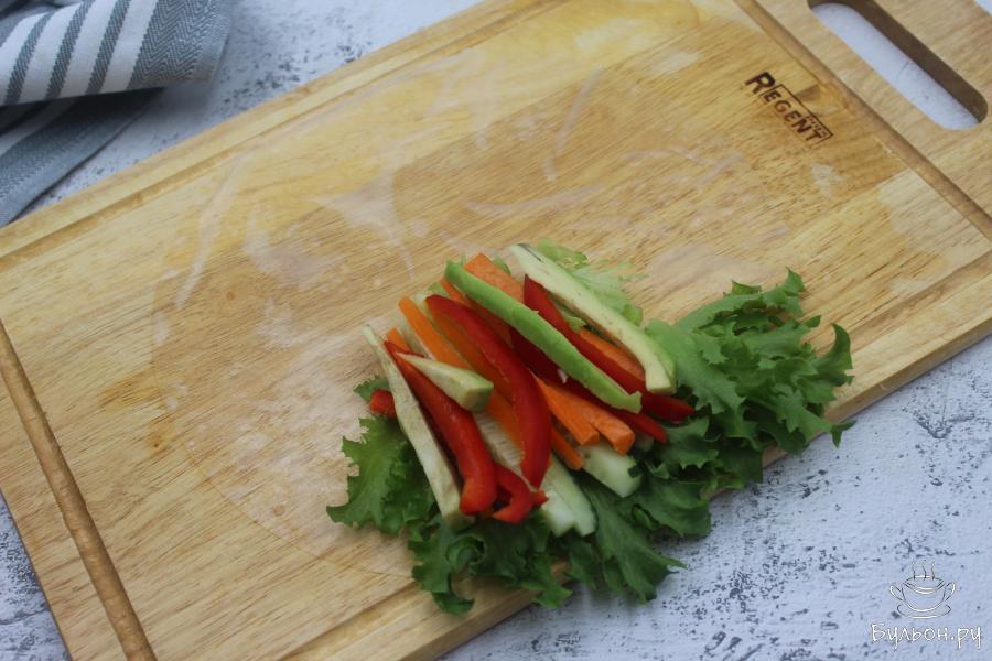 3. Мокрый лист выложите на доску. На него выложите начинку таким образом, чтобы она слегка выходила за рисовую бумагу. Сначала выложите лист фриллиса, сверху выложите 1/4 соломку всех овощей.