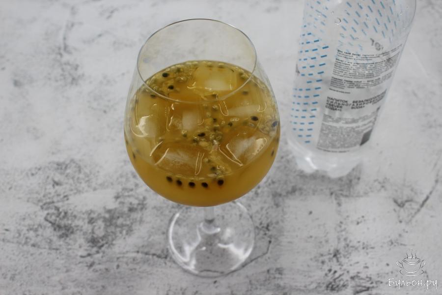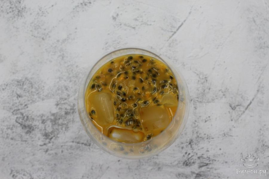 2. Следом добавьте пюре маракуи. Можно использовать, как я, замороженную маракую, а можно свежую. Поскольку фрукт кислый, обязательно добавьте сироп, но классический без добавок. Сироп должен только дать сладость коктейлю, а не придать привкус чего-либо.