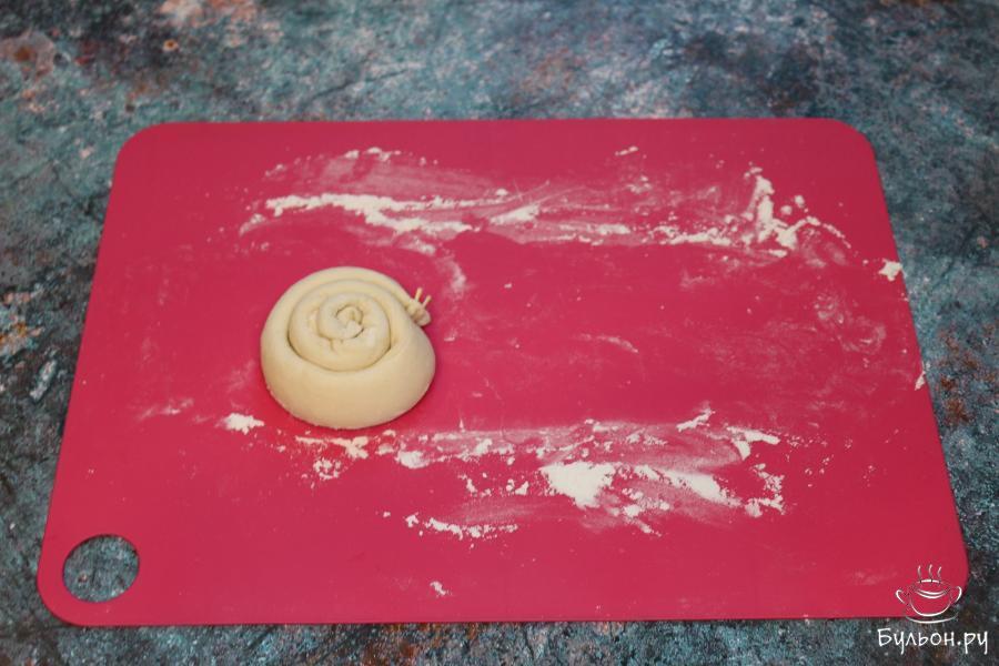 5. Скрепите концы теста так, чтобы творожная начинка оказалась внутри, то есть соедините края теста и защепив их, получится рулетик. Этот рулетик заверните улиткой. Для прочности конец каждой улитки закрепите зубочисткой.