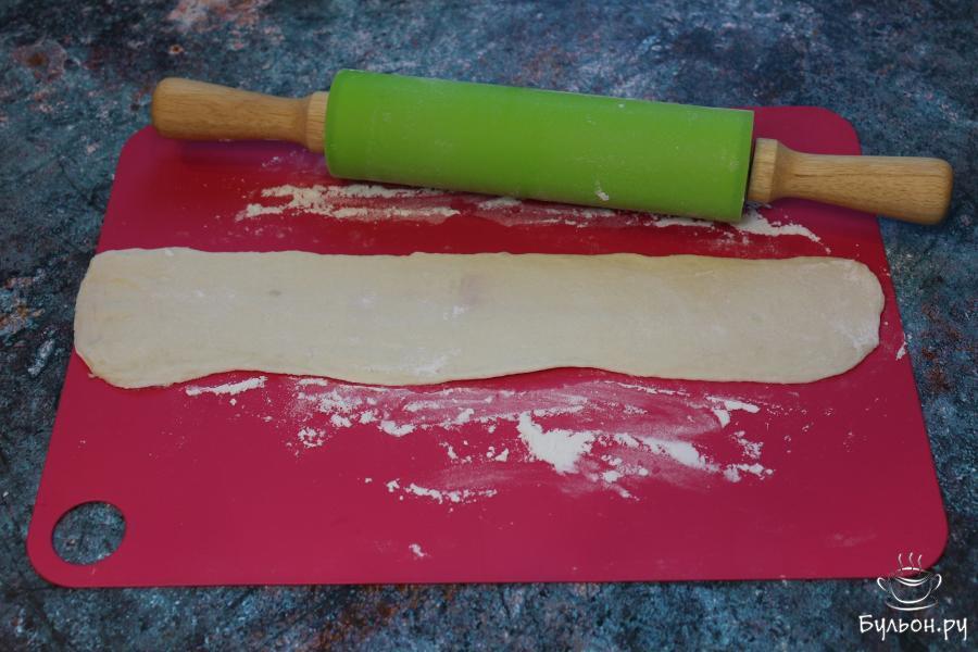 3. Слоеное тесто разделите на 4 равных длинных куска. Каждый кусок раскатайте в продолговатую неширокую и нетолстую лепешку.