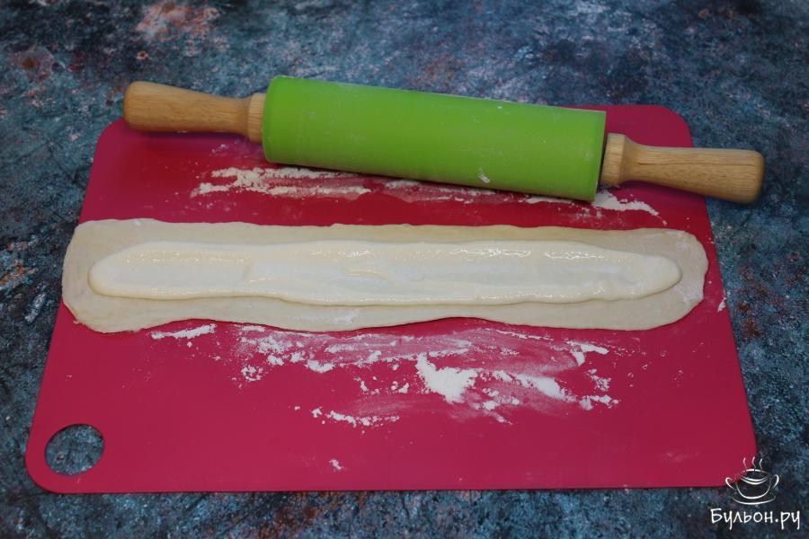 4. Выложите по длине по центру начинку из творога. На каждую полоску выкладывайте по четверти от всей массы.