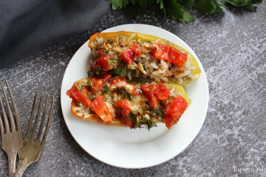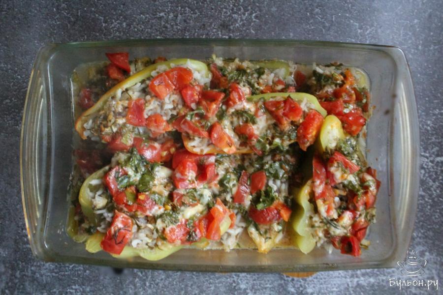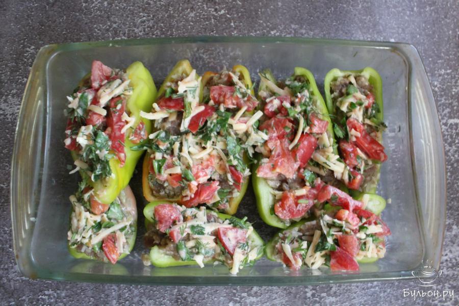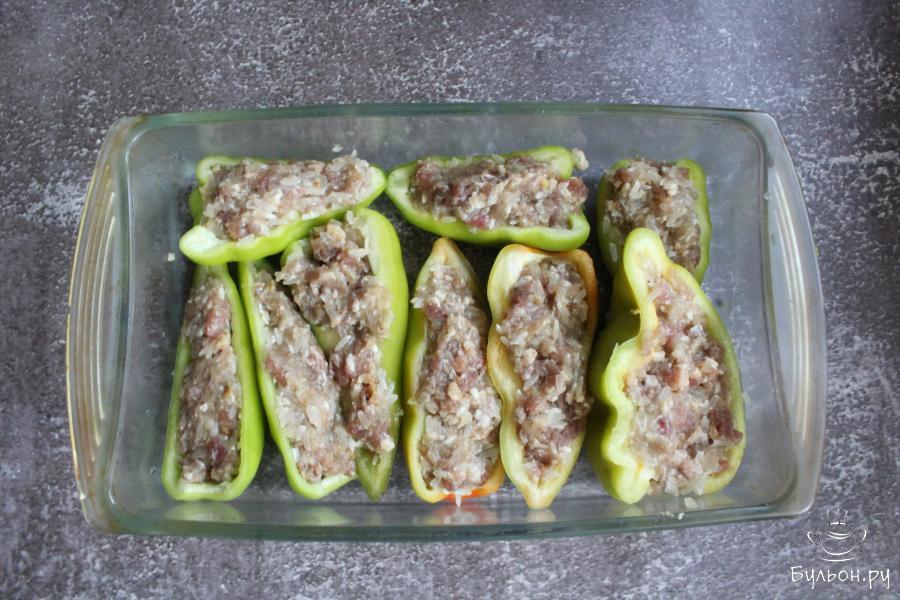 4. Перцы почистить от семечек и плодоножек. Разрезать перцы вдоль пополам. Наполнить половинки перцев фаршем.