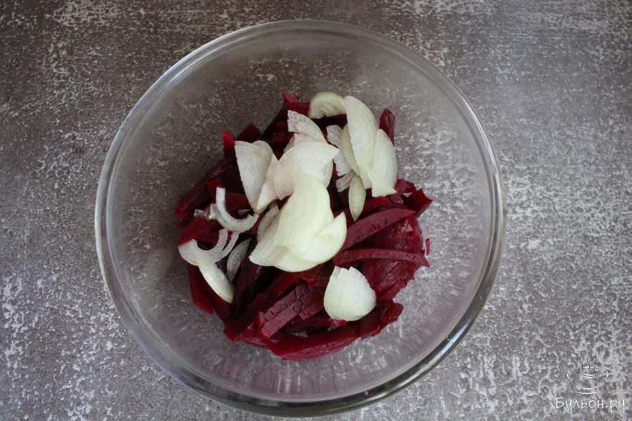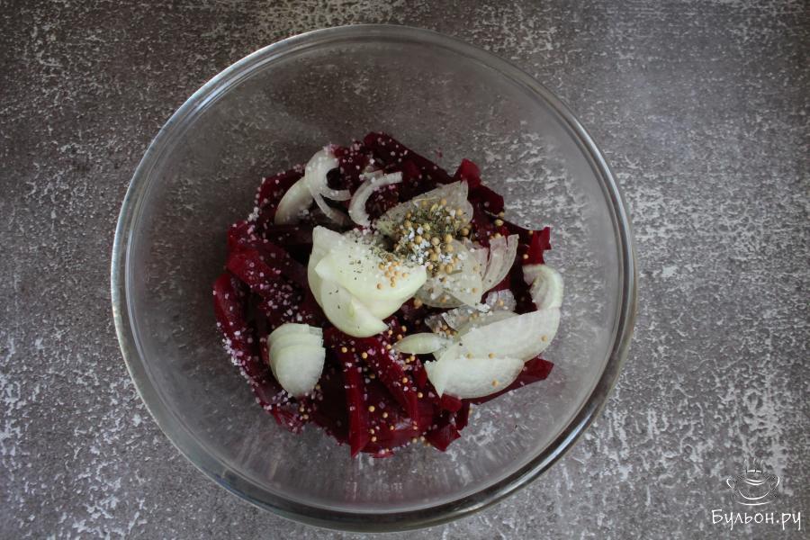 6. Добавить в чашку масло, красный винный уксус, соль по вкусу. Перемешать. Через час закуску можно подать к столу.