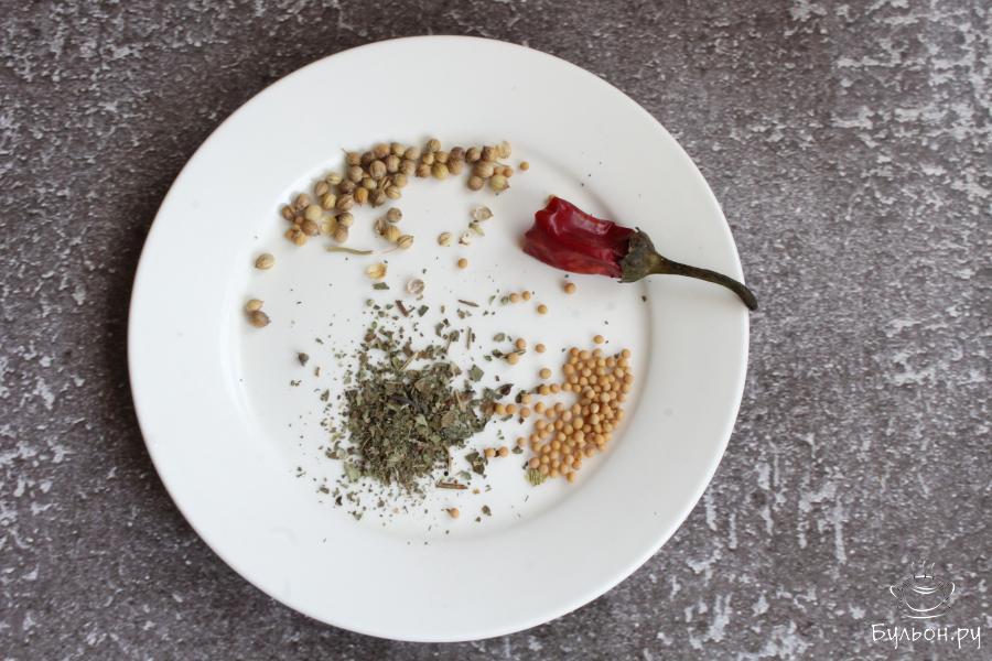 5. Добавить кориандр, зерна горчицы, базилик. Если решили добавлять перец чили, то его надо мелко нарезать.
