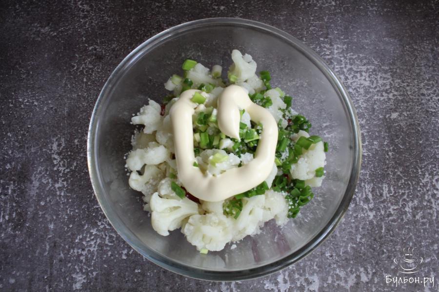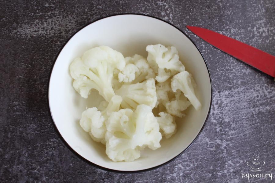 1. Цветную капусту разобрать на небольшие соцветия. Отварить капусту до готовности в подсоленной кипящей воде. Откинуть капусту на дуршлаг и оставить остывать.