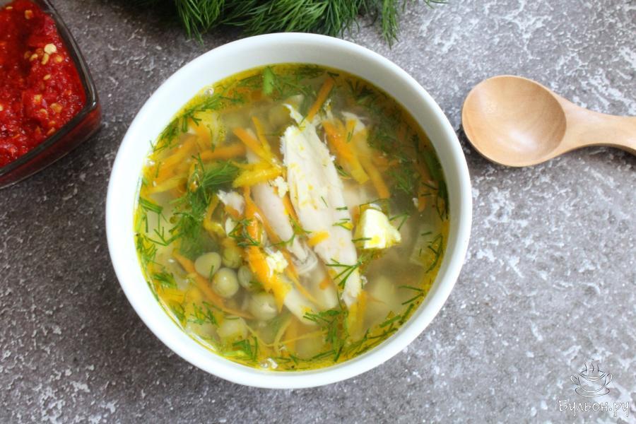 Если вы любите легкие супы, то приготовьте куриный суп с зеленым горошком. Такой суп можно сделать без добавления куриного мяса, например если у вас остался бульон. Можно специально для приготовления супа отварить любую часть курицы и использовать мясо тоже. Суп получается вкусный, насыщенный, ароматный, нежный. Овощи для приготовления можно использовать те, которые вам хочется в данный момент. Зелень тоже берите ту, которую любите.
