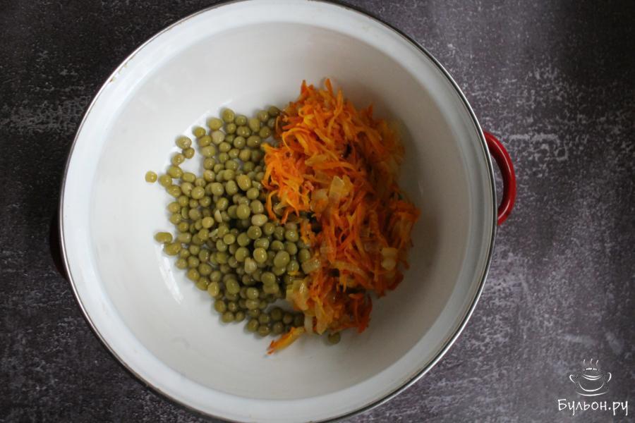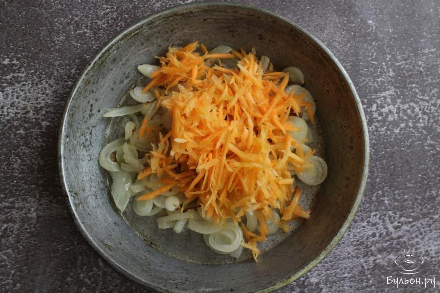 1. Овощи почистить, промыть. Лук мелко нарезать и обжарить его на сковороде с разогретым маслом. Морковь перетереть через крупную терку, добавить к луку и обжарить все вместе 5 минут.