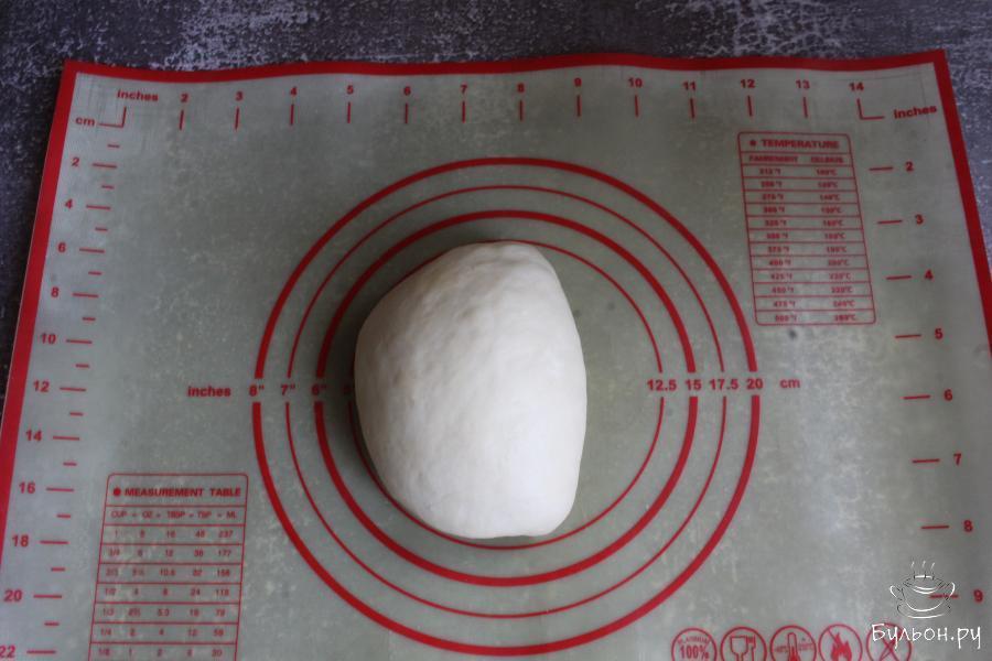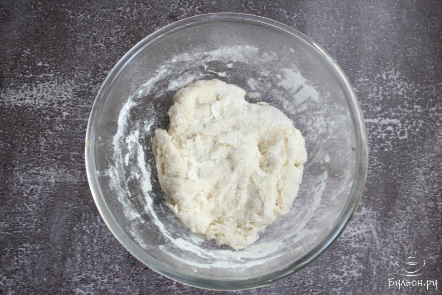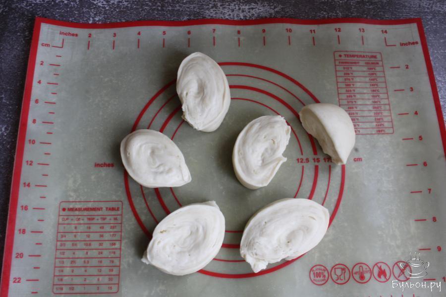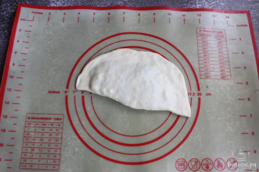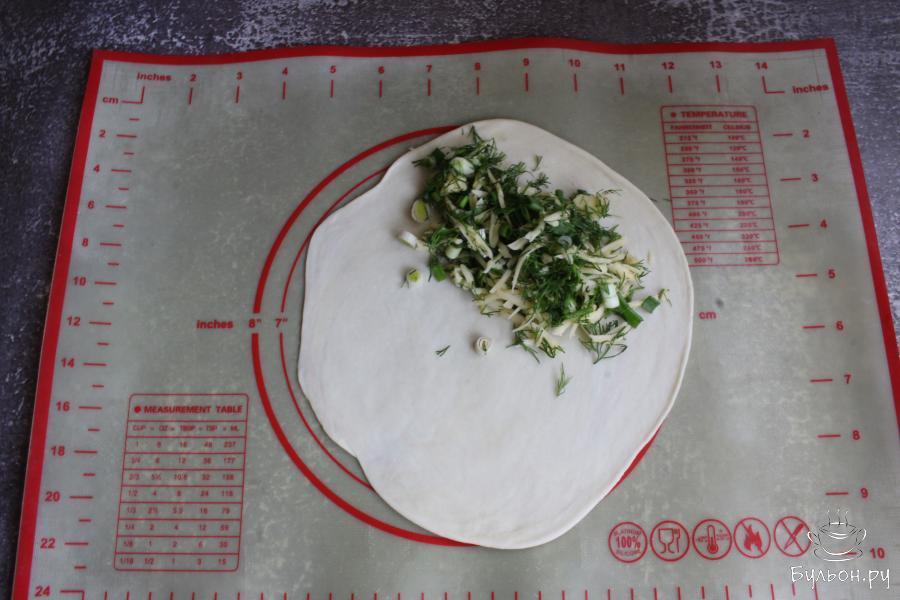 7. Раскатать каждую часть теста в круг. Раскатывать тонко. На край теста выложить 2-3 ст. л. начинки.