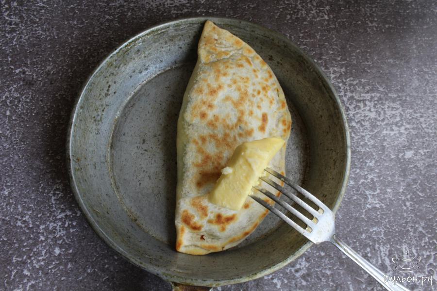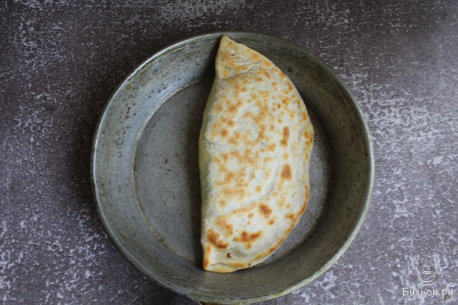 8. Накрыть начинку второй половинкой круга и прижать края, чтобы получился пирожок. Руками аккуратно сплющить и сделать пирожок плоским.