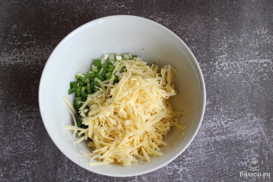 4. Для начинки, всю зелень промыть, обсушить и мелко нарезать. Сыр перетереть через крупную терку и добавить к зелени. Перемешать.