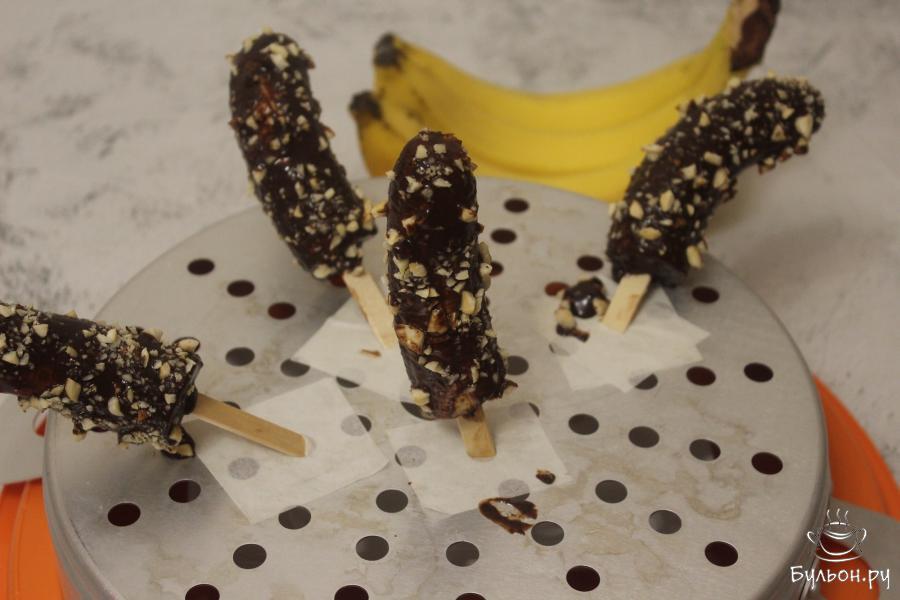 5. Взяв за палочку, обмакните банан со всех сторон в шоколаде и обсыпьте измельченными орехами. Глазированные бананы установите на какой-нибудь платформе, и дайте шоколаду полностью схватиться.