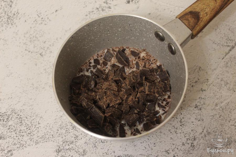 4. В ковшик влейте молоко и добавьте поломанный шоколад. На паровой бане растопите ингредиенты. Затем снимите с огня.