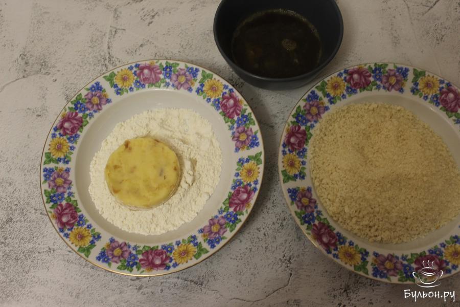3. В мисочке взбейте 1 яйцо с соевым соусом. Из теплой картофельной массы сформируйте котлету, обваляйте ее в муке, затем окуните в яичный кляр, а затем обваляйте в сухарях.