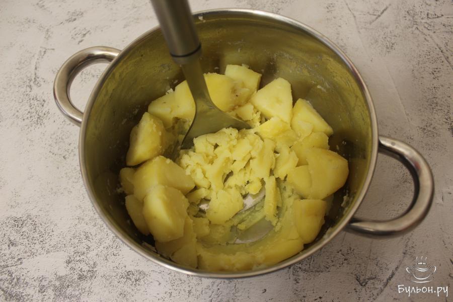 1. Очищенный картофель нарежьте крупными кубиками и отварите, немного подсолив воду. Когда картофель будет готов, слейте с него воду, верните кастрюлю на конфорку и на маленьком огне выпарите остатки воды, но не жгите картофель. Затем растолките картофель в пюре.